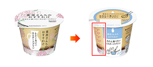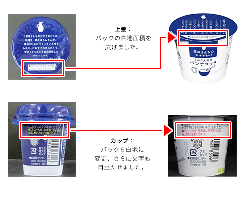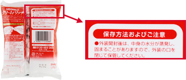 「おいしく召し上がっていただくために」という表現を、より直接的な「保存方法およびご注意」に変更すると共に、表示を白地に赤抜きの文字にし、より見やすく分かりやすくしました。