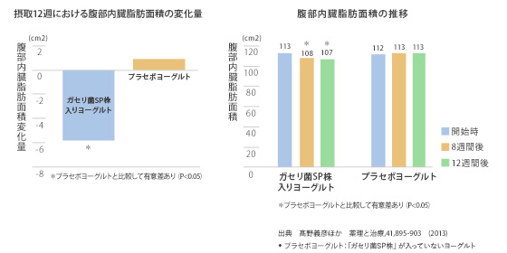 その結果8週間および12週間でガセリ菌を含まないプラセボヨーグルトを摂取した方に比べ内臓脂肪面積が有意に減少しました。