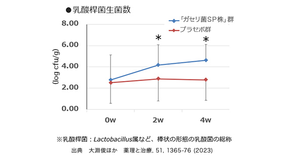 その結果、2週間および4週間でガセリ菌を含まないプラセボカプセルを摂取した方に比べ腸内の乳酸桿菌生菌数が有意に増加しました。