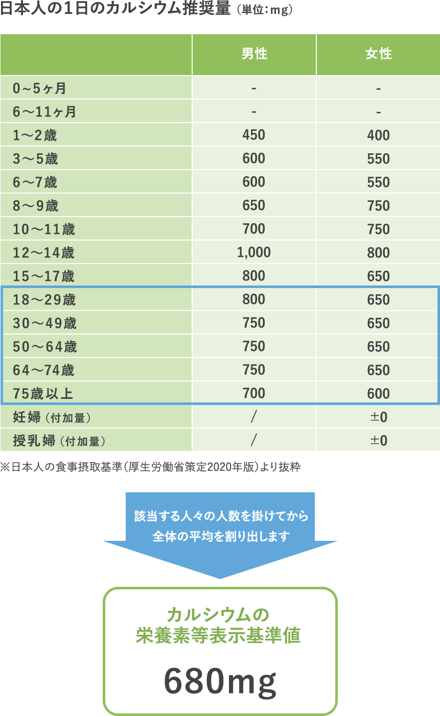 「栄養素等表示基準値」は「日本人の食事摂取基準」で示された栄養成分等の摂取量の基準を性別・年齢別毎の人口により加重平均した値です。 商品に表示されている「〇日分」とは、“日本人の〇日に必要なカルシウムの表示を目的とした基準値”が書かれている、とお考えください。 本来、私たち一人ひとりに必要なカルシウム量は、年齢、性別、身体活動の程度などによって異なりますので、日本人の1日のカルシウム推奨量をご参考にしてください。