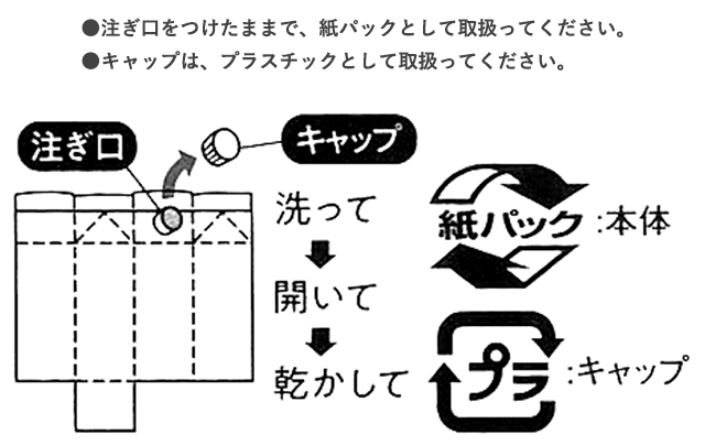 本体は、注ぎ口をつけたままで紙パックとしてリサイクル可能です。キャップをはずして通常の紙パックと同じように取り扱ってください。