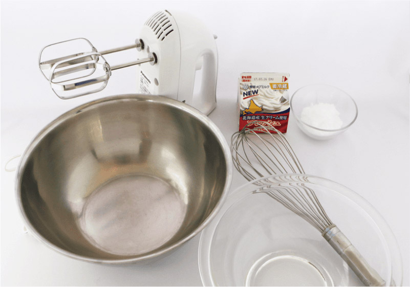 ※クリームを泡立てるボウルはガラス・プラスチックなどステンレス以外のものを(ステンレス製ボウルは、ホイップするときボウル内面が剥がれ落ちて、クリーム中に黒いブツブツができたり、クリームが黒ずむことがあります)。また、小さすぎるとうまく空気と混ざり合わないので、22~30cm位のものを用意してください。