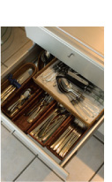 ャスターつきの小さなキャビネットが、うちではダイニングテーブル脇に控えています。一番下の深い引き出しには、ランチョンマットなどが、浅い引き出しの1段めには箸置きや箸置きにもなる豆皿、2段めはナイフ、フォーク、スプーンなどがデザート用も含めて大きさ別に入っています。仕切りには空き箱やかごを利用し、なにがどこにあるかできるだけ見やすく並べる工夫を。とくにカトラリー類は、長方形のものが収まりがいいので、以前、雑貨屋さんで見つけたインドネシア製のかごや、和菓子の入っていた竹かごなどを再利用しています。気楽なメンバーのときは、取り皿に添えて、必要なカトラリーの入ったかごごと、テーブルに出しています。だれにもわかるように収納されていれば片づけを手伝ってもらうときも、いちいち説明がいらないので気軽です。