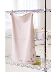 うちのキッチンやパントリーでは、ワイヤーラックを多用して食器や調理道具、食料品などを収納しています。ときどき片づけの途中で、お客さまだったり、急ぎの仕事ができたときなどは、キッチンクロスをさっとかけて目隠しカーテンにすることも。S字フックでクロスの角を2箇所、ラックにゆるく引っ掛けるくらい気楽なものですが、ちょっとしたアクセントにもなるので気に入っています。ベージュ系や茶系のシックなキッチンクロスなら、数枚を連続で使ってもうるさくなりません。キッチンクロスはたいていフックにかけられるように、角やセンターに1箇所、ループ状のテープなどがついていますが、私のオリジナルキッチンクロスは、裏側の角2箇所にテープをつけています。新作ができるたび、キッチンクロスの使い方をあれこれ工夫するのは私の楽しみです。