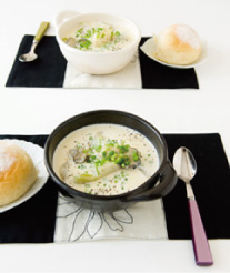 うちのおもてなしで多いのは、カウンターテーブルに大皿料理を並べるビュッフェスタイルです。各自は取り皿とカトラリーを手に、テーブルを回って料理を取り分けます。メニューに汁気のものがあるときは、大皿のほかに小皿やごはん茶碗くらいのボウルなどを用意し、入れ子にして使ってもらいます。お箸、ナイフ、フォーク、スプーンなどのカトラリーは取りやすく並べ、取り皿のそばに。カトラリーをちょっとおしゃれに見せたいときは、トレーにキッチンクロスを敷いてセット。クロスのサイズが大きければ中に織り込んで調節します。写真のキッチンクロスは、オフホワイトのリネンにストライプのパイピングがアクセントになった私のオリジナル。この場所がスタートで、好きなものから順に取り分け、お替りしながらみんなに楽しい時間を過ごしてもらうのが、私のとてもうれしいことです。