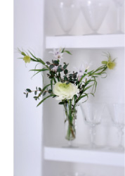 昨年夏のリフォームのとき、キッチンの壁に奥行き14cmほどの棚板を渡したグラス専用の棚を作りました。棚数は6段で、ステムのあるワイングラスやシャンパングラス、背の高いタンブラーなども納まる配置です。グラスは家族や友人からプレゼントされたものや、私が今まで少しずつ買い足してきたものがほとんど。いつも2客ずつ揃えることが多いですが、私の好きなテイストが決まっているせいか、デザインはいろいろでも全体の雰囲気は合っていると思います。うちでおもてなしのときにはここからグラスを自由に選んでもらいますが、透明なグラス棚の中のアクセントになるよう、1箇所に小さくまとめた花を飾っています。この日はちょうどいただいた白いラナンキュラスがあったので、長さを調節してグラスの中へ。庭の緑の葉も添えてラフに仕上げるのが私流です。