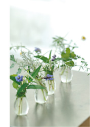 小さな花器は、まわりを見渡すといろいろ見つかるもの。いつも使っているジャムの小ビンとか、青のりの入っていた三角形のビンなどもうちではきれいに洗ってとってあります。透明なガラスビンで統一すれば、形がばらばらでも大小あっても、並べてみると、結構ちゃんとまとまる気がします。