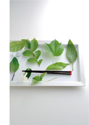 食卓になにかアクセントがほしいとき、私は庭に出て緑の葉っぱを少しだけもらいます。それが小鉢の蓋になり、開けてのお楽しみになったり、あるいは箸置きになったり、生菓子の受け皿になったり。柑橘系の葉やアイビーの葉などをふだんよく使いますが、1枚1枚、ひとつとして同じ形がないことや季節ごとの色も楽しみです。ただ、種類によっては食べ物を載せるのに不向きのものもありますから、詳しい人に聞くなどしてからがよいでしょう。