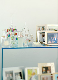 キッチンに続くリビングのコーナーに、家族の写真を飾っています。娘が赤ちゃんのときや息子が子どもの頃のお誕生会、夫と出かけた旅先、私の父母…、懐かしい写真に並び、今では子どもたちの結婚写真も加わりました。日に何度となく行き来する場所ですが、そうそうゆっくり眺めることはありません。でもなんとなく目に入ると温かい気持ちになる、そんなコーナーです。写真立ての横にはおりおり、私の気に入っているものも少し並べています。旅先で見つけたキャンドルの火を消すアンティークのはさみ。以前、夫が買ってくれたガラスのクリスマスツリーは、この季節になると毎年飾ります。息子夫婦がプレゼントしてくれた器。ピッチャーはアシスタントの奈緒美ちゃんのお土産。私が今、気にいっている香水…。お客様の目にも触れる場所なので、お掃除は手を抜けませんが、このコーナーから話題が広がることはしょっちゅうです。