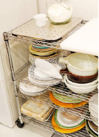 仕事柄、手持ちの食器は多く、整理、収納は毎日の家事の1つです。日常使いの器の収納には頑丈なスチール製のシェルフを多用しています。特にキッチンでは移動のラクなキャスターつきの低いものが便利で、上は作業台としても使っています。棚板は天板を入れて基本は4段。食器に限ったことではありませんが、取り出しやすく、しまいやすくというのが私の収納のこだわりです。たとえばこのシェルフの場合は、重さのある大皿類は一番下の棚に、上の棚は高さを充分にとって、ひんぱんに使う取り皿や、重ねると高さがある鉢などをしまっています。中段は、今回あまり高さがとれなかったので、きちんと重ねてしまえる大きめの平皿などが落ち着いています。でもこれもずっと同じではなく、ときどき前後や上下を入れ替えながら、どれも使いそびれないように気をつけています。
