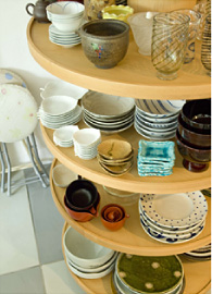 日常使いの大小の食器は、うちではキッチンにおいた可動式の丸い棚に収納しています。この棚は私がデザインしたもので、棚板は5段で高さは約150cm、奥行は約30cm。中心の丸い柱のおかげか、見た目にも安定感があります。普通の食器棚は手前のものばかり出番が増えるのに対し、この丸棚は周囲どこからでも出し入れしやすいのが特徴で、動かせるから掃除もラクです。軽いものが上、下になるほど重いものというのは収納の原則。さらに夫が毎日使う飯碗や中鉢、小皿、お水用のグラスなどは腰をかがめないで取り出せる上から2段め、3段めの、手をのばしやすい場所にまとめています。まわりからは夫思いの収納法とひやかされますが、こういう気遣いも年齢を重ねてくればくるほど、大事なことだと思うこのごろです。