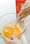卵黄に砂糖の1/3量を加えて泡立て器でよくすり混ぜる。(1)のヨーグルト、牛乳を加えてよく混ぜる(写真a)。 |