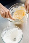 さらに残りの(4)を加え、泡を消さないようにさっくりと混ぜる。 |