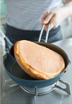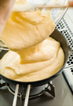 フライパンを中火にかけてサラダ油またはバターを熱し、(6)の生地を流し入れる(写真c)。火を弱めて端が焼けてきたら裏返し、両面を焼いてじっくり中まで火を通す(写真d)。 |