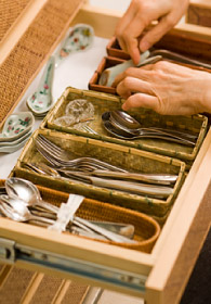 小皿、箸置きなどの小さなものも、同じように浅い引き出しを使っています。そしてときどき場所を入れ替えて、使いそびれないようにもしています。