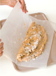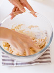 (3)にレーズン、くるみを加え、生地をひとつにまとめる。 |