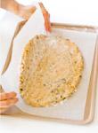 天板にオーブンペーパーを敷き、薄力粉(分量外)をふって(4)の生地をのせる。手のひらでおさえて楕円形にのばし、片側を少しずらして重ねて形を整える(写真c・d)。200℃のオーブンで約25分焼く。 |
