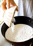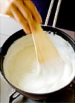 くずもちは固まってプルプルした食感がおなじみですが 練り上げたばかりのできたてはゆるゆるとした食感です。 私はこのやわらかさが大好き。 今回、ご紹介するミルクくずもちは くず粉を牛乳で溶かし、生クリームも少し加えるので 仕上がりはまろやかで、とてもクリーミー。 温かくても冷めても、どちらもおいしくいただけます。 好みで黒みつ、きなこ、粒あんなどを添えてどうぞ。
