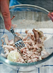 ボウルにサバを入れてほぐし、にんにくはつぶして混ぜる(写真b)。 |