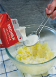 じゃがいもが充分やわらかくなったらペーパーをはずし、熱いうちになめらかにマッシュする。牛乳、生クリームを順に加え(写真a)、よく混ぜる。 |