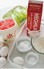 クレープを作る。ボウルに卵を割りほぐし、砂糖を加えてよく混ぜる。牛乳を加えてさらによく混ぜ、Aの粉を合わせてふり入れ、粉っぽさがなくなり、なめらかになるまでさっくりと混ぜ合わせる。 |