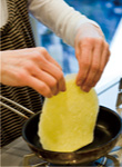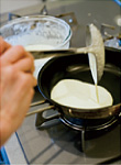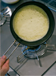 フライパンにサラダ油を熱し、(3)の生地をお玉1杯分くらい流し入れ、手早く広げる(写真b・c)。 |