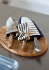 料理の仕事をしていると、包丁や専用ナイフの類はどうしても増えてきます。毎日使うものは、きれいに洗って水気を拭き取ったあと、シンク下などに収納していますが、日常使いでないものをしまうときや、仕事で家からほかの調理道具と一緒に持ち出すときなどは、写真右のようなキルティング地を2重にした専用のカバーをかぶせています。