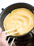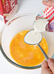 オムレツを作る。ボウルに卵を割りほぐし、牛乳、生クリームを加え混ぜ(写真a)、軽く塩、こしょうする。 |