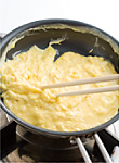 フライパンを十分に熱してサラダ油大さじ1をなじませ、半量の卵液をジュッと流し入れる。菜箸で大きく混ぜながら(写真b)、半熟状になったら(写真c)片側に寄せて形作る。残りも同様にして焼く。 |
