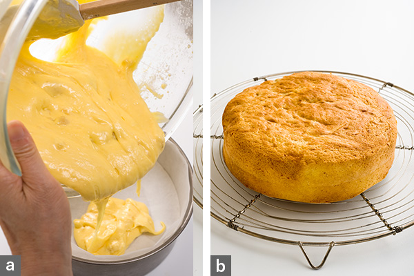 - 4. バナナを粗くつぶし、(3)の生地に加えて手早くさっくりと混ぜ合わせる。型に生地を流し入れ(写真a)、平らにならす。
