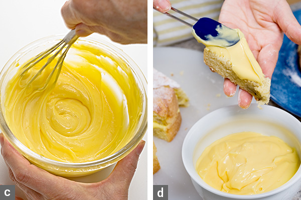 - 7. 耐熱ボウルに薄力粉、コーンスターチをふるい入れ、グラニュー糖、牛乳を加えて静かに混ぜる。ラップをふわっとかけ、電子レンジで約1分30秒加熱する。熱いうちに手早く泡立て器でよく混ぜる。なめらかになったら卵黄を加えて混ぜ、さらに生クリーム、水きりヨーグルトを順に加えて混ぜ合わせる(写真c)。
