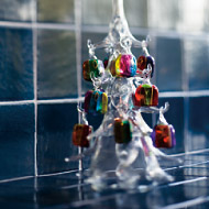 ちでは昔から夫がクリスマスの行事をとても大切にしています。食事も生活スタイルもすべて洋風な家庭で育った夫にとってクリスマは一年でもっとも華やぐ日 なのだとか。そのおかげでわが家は12月に入るとクリスマス一色。子どもたちが小さいころは大きなツリーを飾りましたが、今は思い出の品や私の手作りの リース、キャンドルなどを、玄関やリビングのコーナー、キッチンなどに飾っています。長女誕生の記念に夫が買ったドールハウスは、今では年に一度、この時 期に出しています。ミニチュアのツリーやリース、食卓のごちそうなどをのぞき込むたび、思わず笑顔がこぼれます。写真のガラスのツリーは、夫がだいぶ前に プレゼントしてくれた私の宝もの。30cmほどの透明なツリーにカラフルな色ガラスのオーナメントをさげて飾ります。ガラスのツリーはその後も違う種類を 見つけると1つ、また1つと買い足してくれて、今ではうちのクリスマス迎えのシンボルのひとつです。