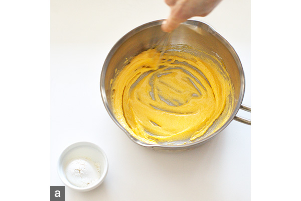 - 1. 小鍋に卵黄を入れ、グラニュー糖を加えて小さな泡立て器でよくすり混ぜる。白っぽくなってきたら薄力粉をふるい入れてさらによく混ぜる。
