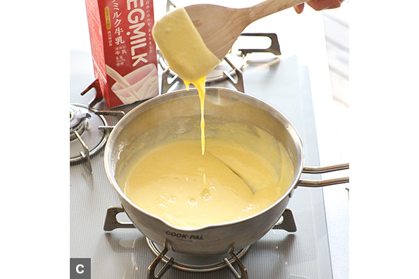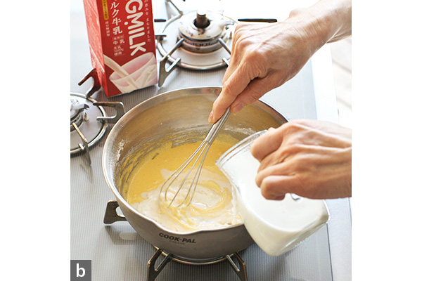 - 2. 牛乳は耐熱容器に入れて電子レンジで沸騰直前まで温め、(1)の鍋に少しずつ加えて溶きのばす。