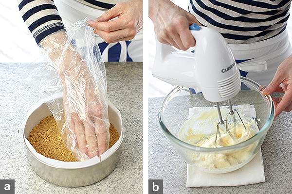 - 2. ビスケットをビニール袋に入れ、すりこぎなどで粗くつぶす。(1)のバターを加えて混ぜ合わせ、型の底に敷き詰める。このときにビニール袋を裏返して手を入れ、押さえると手が汚れずに作業できる(写真a)。