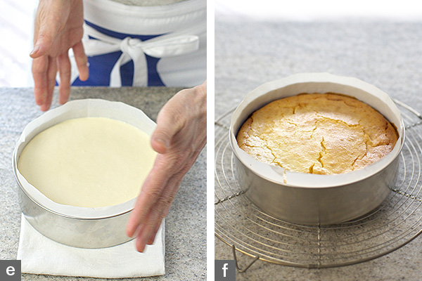 - 7. 170℃のオーブンで約45分焼く。焼き上がったらオーブンから出して粗熱を取る(写真f)。型から出してペーパーをはずし、網の上で冷ます。冷蔵庫で冷やしてもおいしい。切り分けて好みで粉糖をふる。