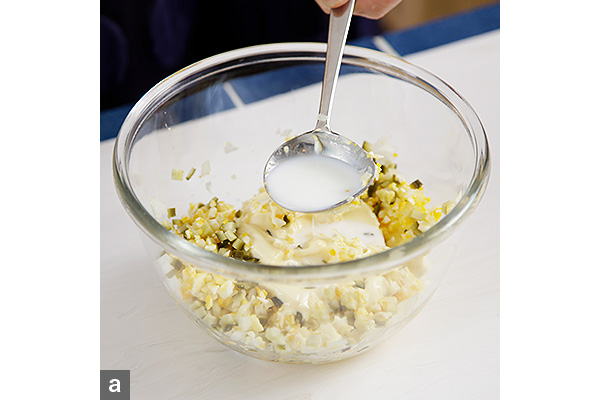 - 5. ボウルにマヨネーズを入れて牛乳でのばし、ゆで卵、玉ねぎ、ピクルスを入れて軽く混ぜる。かたければ牛乳を足し(写真a)、塩、こしょうで味を調える。