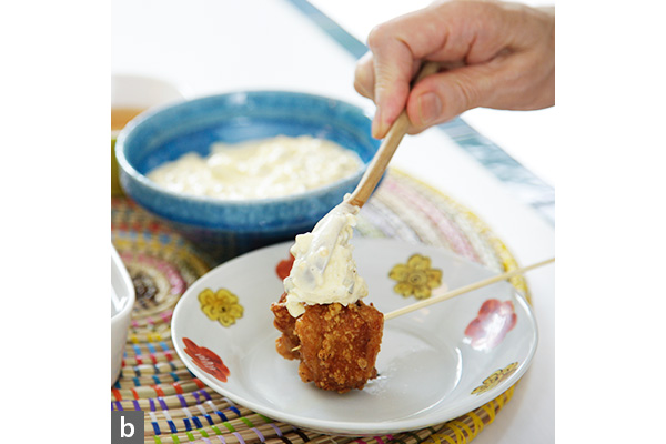 - 7. 器に揚げたてを盛り、甘酢をつけてタルタルソースをかけたり、別々に添えるなどしていただく(写真b)。