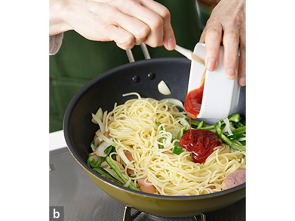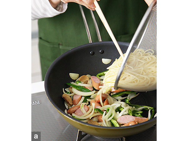 - 7. スパゲッティをゆでる間に、フライパンに半量のサラダ油を熱し、ウィンナーを炒めてから玉ねぎ、マッシュルーム、ピーマンを順に加えて炒める。残りの油を足し、ゆでたてのスパゲッティを加えて炒め合わせる(写真a)。