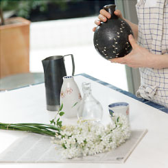 私はこれまでお花をきちんと習ったことはないのですが、家の中には私なりのいけ方でいつも花を飾っています。今から30年ほど前、私はテレビの料理番組の仕事で広島まで月に一度通っていました。器を用意し、料理を作って盛りつけ、食卓に小さいお花をいけることまでが私の仕事。当時まだ経験の浅い私が、料理はともかく、お花をどういけたらいいのか、最初は戸惑いました。それでも回数をいけるうちに花のみせ方や私なりの好きな形がだんだんわかってきて、とても勉強になった数年間でした。今も料理の仕事でお花をちょっと添えたいときは庭に出て、季節の花に草木やハーブの緑を組み合わせてよくいけています。ふだんの暮らしでも家のあちこちに花はたやしたことがありません。花器には花瓶として作られたものより徳利、つゆ入れ、鉢、水さし、ミルクピッチャー、グラスなどの食器を多用しています。気のせいか、このほうがお花の表情もなんだかくつろいだように見えます。