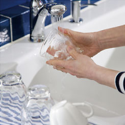 仕事や家事が立て込んでくると、つい家の中を忙しく動き回ってしまう私。ちょっと休憩するときは牛乳や冷たい水をグラスに注いでゆっくり飲み干したり、ミルクティーやカフェオレなどをおいしくいれて飲むことが多いです。食事のときの洗いものと違って、飲みものに使ったグラスやカップは汚れも軽く、使い終わったらすぐに洗っておくのが習慣です。高台の回りや底は見落としがちな部分なので、ちょっと念入りに。すすいだあとは水気をきり、乾いたふきんで拭き取ります。私がよく行く知り合いのお店はいつもグラスがピカピカで、なにを飲んでもいつもおいしく感じます。ご主人を見ていると、乾いた麻のふきんでグラスの内側、外側、底を何度もていねいにキュッ、キュと拭き上げています。あんなふうにするときれいになるのねと参考にしながら拭き終えたグラスやカップ。所定の場所に片づけてまた次の出番にそなえておきます。
