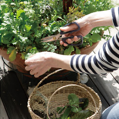 いつも初夏のころ、ハーブの苗を集めて寄せ植えを作っています。鉢は毎年使っている素焼きの大鉢、下にはキャスター付きの台を今年も使います。でき上がるとかなり重くなるので軽く移動できるこのキャスターはとても便利。さてハーブの種類ですが、今年はサラダ用を中心にひと鉢に集めてみました。イタリアンパセリ、フェンネル、ディル、ルッコラ、コリアンダー、チャイブ、マスタード、カラーリーフなど全部で11種類。鉢の中央がこんもりするように背の高くなるものを真ん中に植えると、水やりや伸びたときの手入れがラクです。数日すると鉢にもなじみ、数週間もすれば陽当たりのよいわが家のテラスでグングンと葉を繁らせるほど。そうなってきたら風通しをよくするためにも少しずつ刈り込みます。調理を始める前にキッチンからはさみを持ってきて収穫すれば、いつでもとびきりフレッシュなハーブサラダが楽しめます。
