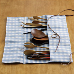 ピクルスをはさんだり、サラダを取り分けたりする大小のトング。汁気のある料理に添える、すくいやすいスプーン。飲みものを混ぜるマドラー……、こういった道具は木や竹のもの、塗りものなどが私は大好きで、集めているうちに増えてきました。当たりがやわらかいので器にもやさしいですし、なにより食卓が暖かく感じられます。使い終わったら引き出しに収納していますが、形がまちまちなのでじかに入れるのは避け、布袋に入れています。便利なのは写真のように仕切りとかぶせをつけたもの。なるべくゆったりと入れ、くるくると巻いてひもで結わえれば納まりがよく、持ち運びも便利。私は料理の仕事でカトラリーや調理道具を荷作りして持ち運ぶときも、よく同じようにしています。