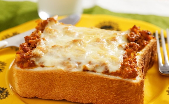 朝ごはんにも酒のつまみにもなる野菜たっぷりのミートソースをのせたチーズトーストが人気です。