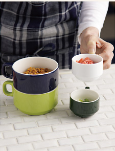 大好きなカフェオレを飲むときに、私が愛用しているこのマグカップ。デミタスカップもお揃いで作りました。色は白、紺、黄緑、赤など、私の好きな色を組み合わせています。一番の特徴は重ねられるところで、これは収納のためばかりでなく、重ねて使うシーンも考えてのことです。すとんとした形は重ねると小さな丸い重箱みたい。おかげで飲みもの以外の出番がとても多く、重宝しています。例えば漬けものや佃煮などの常備菜が少しずつ残ったらこれに入れて重ねます。冷蔵庫に入れるときは一番上にだけラップをかければいいので手軽。カレーライスのときなどは1人分ずつデミタスカップに福神漬けを入れて添えたりしています。身近にある気に入った器は、とにかく使い方を何通りも考えてとことん試すのが好きな私。この性格はこれからもきっと変わらないかと思います。