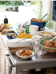 私の平日の日中は、料理撮影やその準備、打ち合わせなどが多いので、昼ごはんはスタッフや仕事仲間のみんなと囲むビュッフェスタイルです。大皿に並ぶのは試作を重ねているレシピだったり午前中の撮影で撮り終えた料理だったり。炒めもの、揚げもの、煮もの、サラダに、私の大好きなお刺身があり、焼き魚あり、箸休めの煮豆や漬けものなども並びます。とくに試作中のレシピは、みんなのおいしいという感想をきくとほっとして私の中でレシピの完成が近づきます。ごはんはそのときのおかずに合わせて白米のほか、雑穀入りや玄米、タイ米など。人数が多いときは3種類くらい用意しています。コンロの近くにワゴンテーブルなどを配置し、温かく食べたいものは火にかけ、おかずを並べ、取り分け用の皿を重ね、箸はまとめてかごに入れて準備完了。各自が取り皿を手に好きなものをのせて、何度でもおかわりしていただきます。平日は会社勤めで、料理の仕事もするうちの息子は「ここの昼ごはんはいつもスゴイな」と感心しています。私もここでのにぎやかな昼ごはんが大好きです。何気ない一品でもていねいにおいしく作ることで、感謝の気持ちがみんなに伝えられたらいいな。心の中でそう思いながら今日もうちの昼ごはんが始まります。