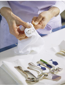 旅先のアンティークショップなどに寄ると、私はよく銀のカトラリーを探します。コーヒースプーンやデザートフォーク、茶葉用のさじ、スパイス用のミニスプーン、小さなトング……。セットのものもあれば1本ずつしかないものもあり、その形が気に入るとつい欲しくなってしまいます。家では小袋に入れて引き出しに収納していますが、使わずにおいたり、使っていても時間経過でどうしても表面が黒ずむのは銀器にとって仕方のないこと。そこで私はちょっと手が空いたとき、引き出しからお気に入りを少しずつ出して磨くようにしています。全部いっぺんにやろうとすると大変になってしまうので、何回かに分けながら順番に手入れができればいいかなと気楽に考えています。市販の専用クリーナーのほか、キッチンにある身近なものでもきれいになります。ぬるま湯に浸したやわらかい布に重曹をつけて磨く方法です。どちらも磨いたあとはきれいに水洗いして、乾いたやわらかい布で水気を拭き取れば美しい銀色がよみがえり、食卓でまた気持ちよく使えます。