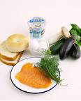 | 4 | ベーグルはオーブントースターで軽くあたため、横半分に切って切り口にバターを塗る。スモークサーモン、(3)をのせ、ディルを添える。 |