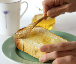 私が長女を出産したあと、すぐに母に頼んで作ってもらったのが、はちみつバタートーストでした。甘いものがそれほど得意でない私も、出産後の安堵した気持ちと、はちみつバターのやさしい甘みにひと息ついたことを思い出します。今でもはちみつバタートーストは私の好物で、ときどき食べたくなって作っています。作り方は食パンを3cmくらいの厚切りにしてこんがりトーストし、あつあつにバターとはちみつを端から端までびっしりと塗ります。どこを食べても塗ってないところがない、この塗り方も私のこだわりです。はちみつが容器に少しだけ残っているようなときは、やわらかくしたバターを加えて練り混ぜ、はちみつバターを作っておくこともあります。最近はバリエーションで、バターの上にグラニュー糖とシナモンを塗る食べ方も気に入っています。