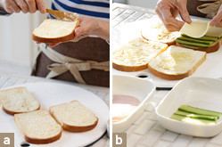 パン4枚の片面にバターとマスタードを塗り(写真a)、2枚1組にしてきゅうりとチーズ、きゅうりとハムをのせ、それぞれサンドする(写真b)。